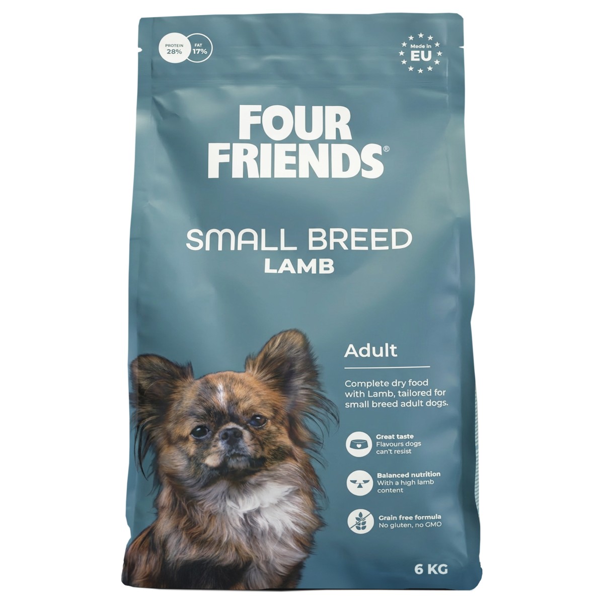 FourFriends Small Breed Adult Lamb är ett energirikare foder anpassat för aktiva små hundraser, som ofta har ett högre energibehov än större hundar. Det spannmålsfria receptet innehåller lamm som en lättsmält proteinkälla med hög biologisk tillgänglighet.