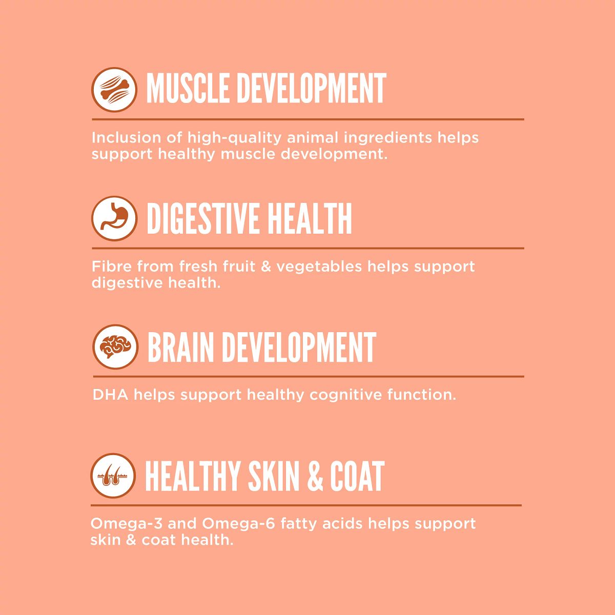 - 85 % animaliska ingredienser från kyckling, kalkon, fisk och ägg - perfekt för att stödja valpens snabba utveckling.