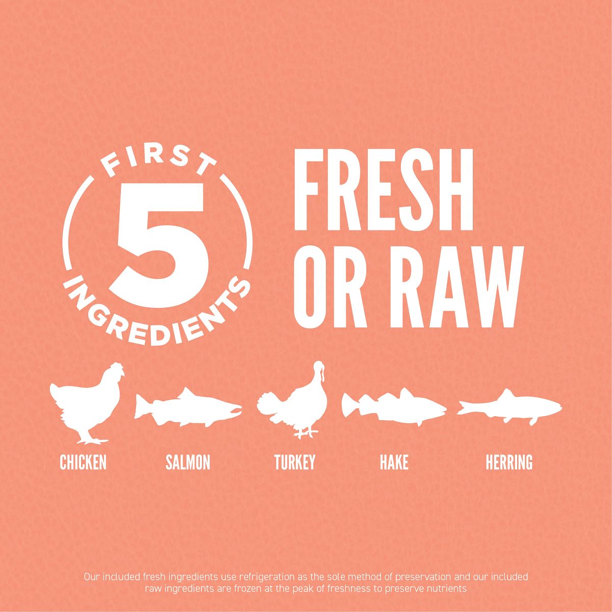 Färsk kyckling (18 %), rå lax (12 %), rå kalkon (10 %), rå hel blåvitling (4 %), rå hel sill (4 %), rå kalkonlever (4 %), färsk kycklinginmat (lever, hjärta) (4 %), färska ägg (4 %), torkad kalkon (4 %), torkad kyckling (4 %), torkad sill (4 %), torkad kycklinglever (4 %), torkade ägg (4 %), hela röda linser, hela pintobönor, kycklingfett (3 %), hela gröna linser, hela marinblå bönor, hela kikärter, hela ärtor, sejolja (2 %), linsfiber, råa nyzeeländska gröna musslor, torkad kelp, färsk hel butternutpumpa, färsk hel pumpa, salt, torkad cikoriarot, färska hela äpplen, färska hela morötter, färska hela päron, färsk hel zucchini, färska rödbetor, färsk grönkål, färsk spenat, färska kålrotsblad, hela tranbär, hela blåbär, hela saskatoonbär, gurkmeja, mjölktistel, kardborrerot, lavendel, marshmallowrot, nypon.