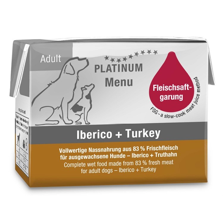 Menu Adult Iberico + Turkey är ett komplett våtfoder för hundar av högsta kvalitet, gjort på gjort på 83 % färskt Iberico- och kalkonkött. Vid tillagningen av PLATINUM Menu tillsätts inget vatten - istället tillagas våtfodret helt i sin naturliga köttsaft! Tillverkningsprocessen är inte enbart extra skonsam, den garanterar även att de näringsämnen som är så viktiga för hundar förblir helt naturliga och outspädda. Allt detta säkerställer att PLATINUMs våtfoder är extremt hälsosamt och lättsmält.