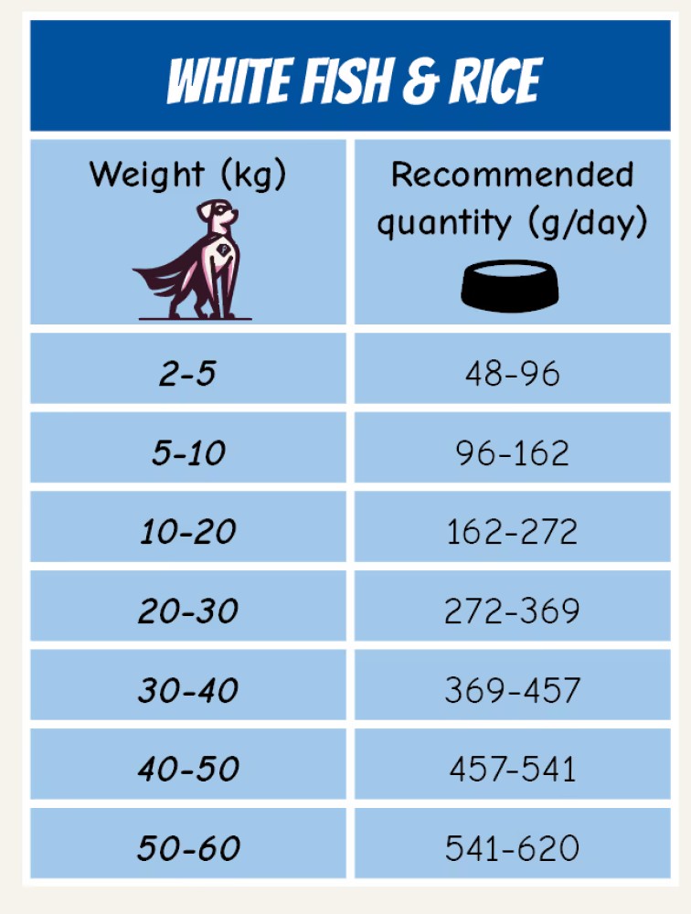 Fodertabell finns bland bilderna. Varje hund är unik och därför kan den faktiska mängden foder variera beroende på hur gammal och hur aktiv din hund är.