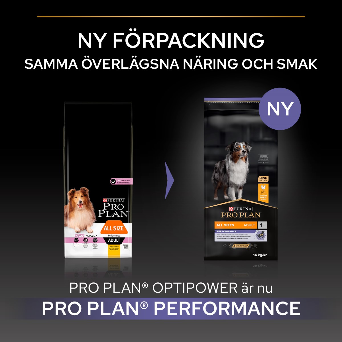 Purina® Pro Plan® All Sizes Adult Performance torrfoder för hundar innehåller alla näringsämnen din hund behöver för långvarig hälsa. Det har skräddarsytts för att bidra till att främja uthållighet, snabb muskelåterhämtning och friska leder.