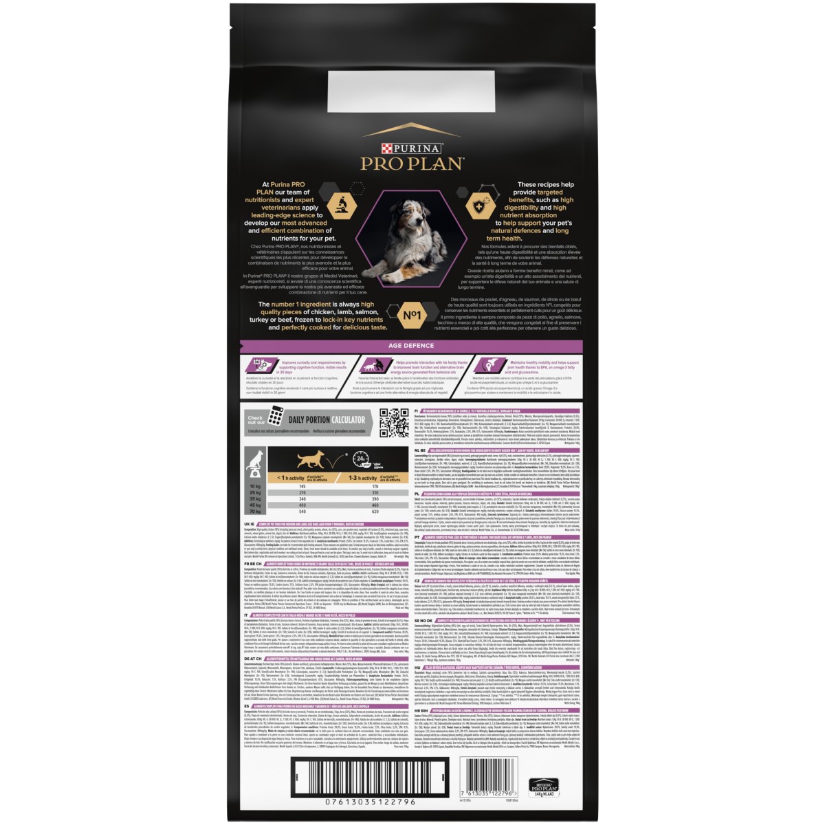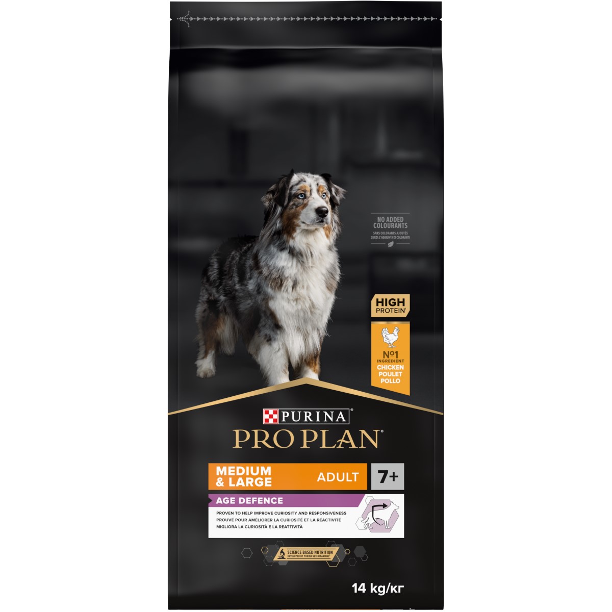 Purina® Pro Plan® Medium & Large Adult 7+ Age Defence torrfoder för hundar innehåller alla näringsämnen din hund behöver för en god hälsa. Det innehåller också en blandning av näringsämnen som vetenskapligt bevisats förbättra hjärnfunktionen hos äldre hundar och hjälper dem vara aktiva och alerta längre.