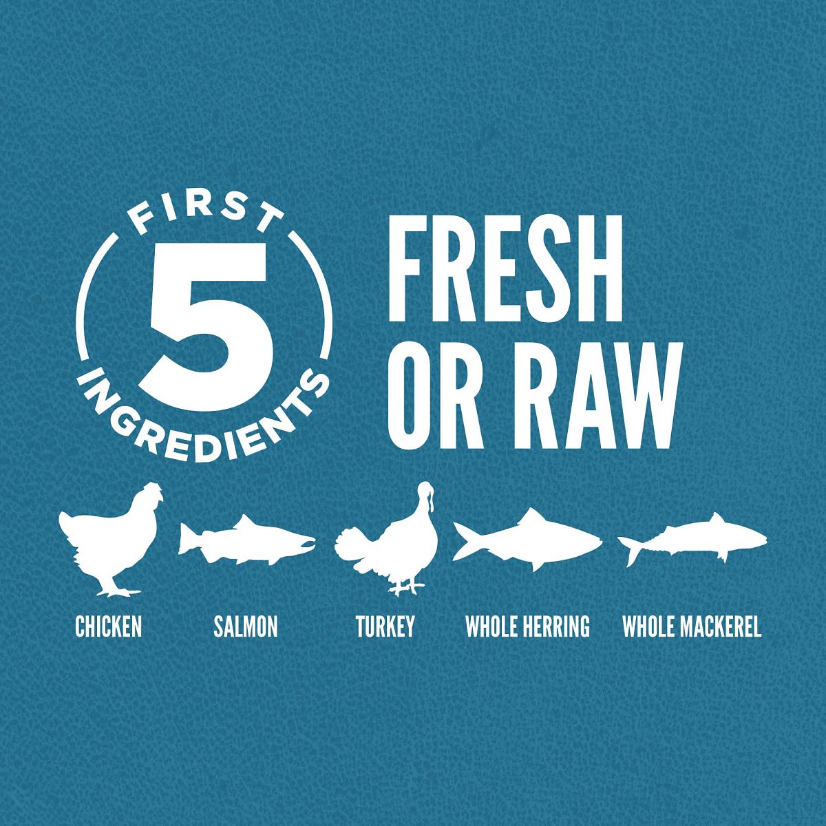 - 90 % animaliska ingredienser från färsk eller rå fågel och fisk, vilket ger högkvalitativt protein och naturliga fetter.